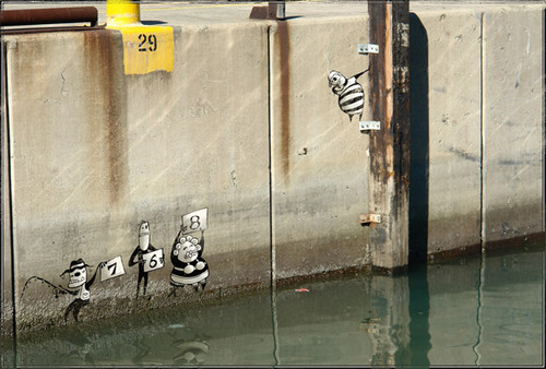 The cracks in the pavement and discolorations in the concrete are but background to this fantastic series of urban artwork.