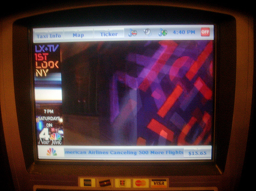 Television in back of New York taxi. Note that crawl on bottom of screen informs me that my flight to Austin has been cancelled.