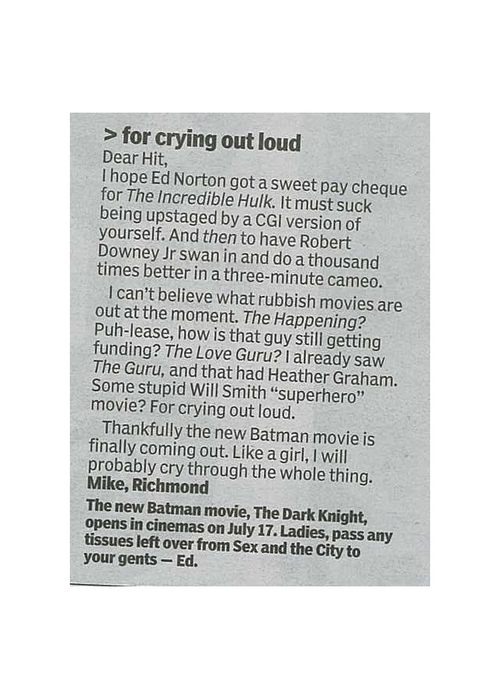my email to friend, turned letter to HiT: Original email text: Subject: Hulk SMASH.. Tim Roth awesome but i hope Ed Norton got a sweet paycheck.. must suck being upstaged by a CGI version of yourself.. and THEN have RDJ swan in and do 1000x better performace in a 3min cameo i can’t believe what crap movies they’ve got out at the moment.. The Happening? puh-leaze.. how is that guy still getting funding? The Love Guru? i already saw The Guru, and that had Heather Graham some bs Will Smith “superhero” movie.. ffs.. thank fuck the new Batman’s finally coming out which, like a girl, and like when i saw The Crow, i will prolly cry through the whole thing