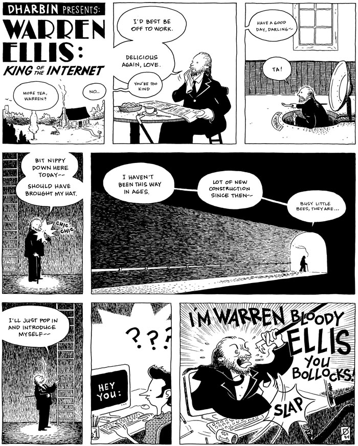 Posted on December 16, 2008September 6, 2015 by m1k3y DHARBIN! :: Strip 08-1215 :: “Warren Ellis: King of the Internet” Share this: Click to share on X (Opens in new window) X Click to share on Bluesky (Opens in new window) Bluesky Click to share on Tumblr (Opens in new window) Tumblr Click to share on Facebook (Opens in new window) Facebook Click to share on Reddit (Opens in new window) Reddit Click to email a link to a friend (Opens in new window) Email Like Loading... Related