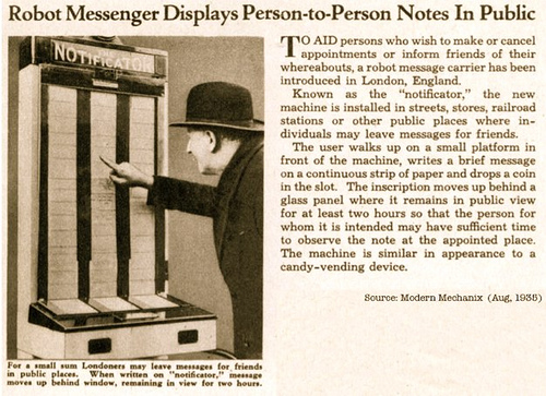 Posted on February 10, 2009September 6, 2015 by m1k3y Robot Messenger Displays Person-to-Person Notes In Public (Aug, 1935) (via caseorganic) Share this: Click to share on X (Opens in new window) X Click to share on Bluesky (Opens in new window) Bluesky Click to share on Tumblr (Opens in new window) Tumblr Click to share on Facebook (Opens in new window) Facebook Click to share on Reddit (Opens in new window) Reddit Click to email a link to a friend (Opens in new window) Email Like Loading... Related