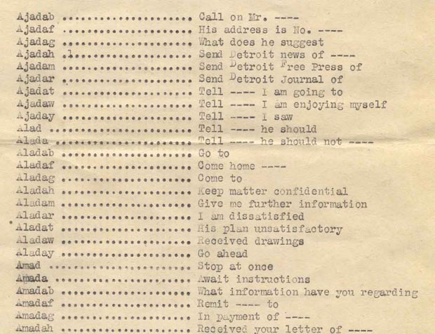 Posted on May 30, 2009September 6, 2015 by m1k3y The Secret Telegraphic Codes of Henry Ford | Boing Boing Gadgets Share this: Share on X (Opens in new window) X Share on Bluesky (Opens in new window) Bluesky Share on Tumblr (Opens in new window) Tumblr Share on Facebook (Opens in new window) Facebook Share on Reddit (Opens in new window) Reddit Email a link to a friend (Opens in new window) Email Like Loading... Related
