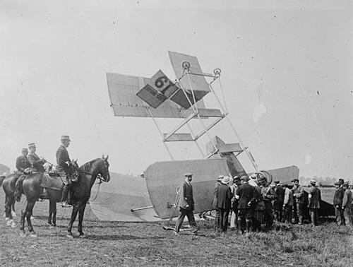 “WHAT A WRECKED BIPLANE LOOKS LIKE.— M. L. Breguet’s Breguet machine after his smash-up in front of the Grand Stand”