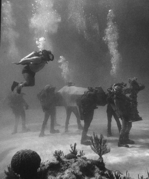 “Actors prepare to shoot a big scene involving an underwater funeral procession while a scene coordinator hovers above them. The actors had to wait four weeks to shoot the scene, because bad weather made the depths too murky.”
