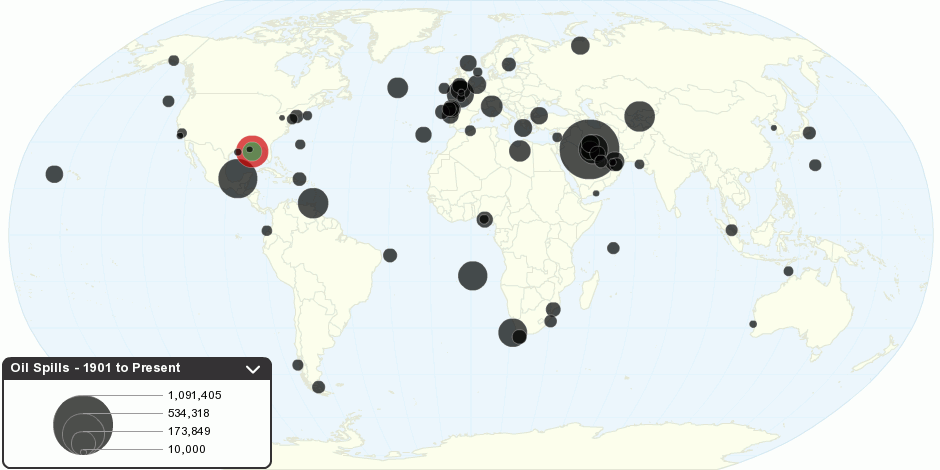 Posted on June 18, 2010September 6, 2015 by m1k3y datavis: The Largest Oil Spills in History, 1901 to Present Share this: Share on X (Opens in new window) X Share on Bluesky (Opens in new window) Bluesky Share on Tumblr (Opens in new window) Tumblr Share on Facebook (Opens in new window) Facebook Share on Reddit (Opens in new window) Reddit Email a link to a friend (Opens in new window) Email Like Loading... Related