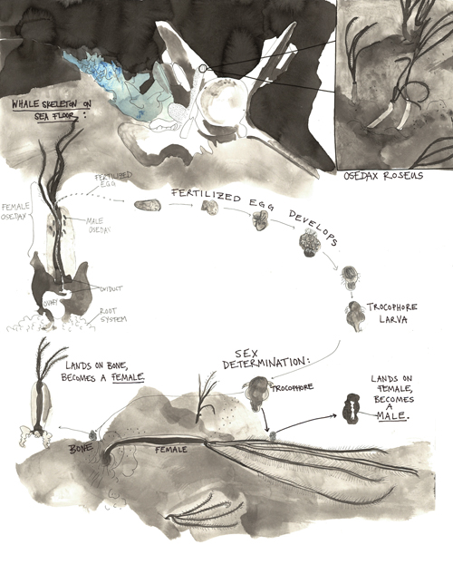 Scientists have categorized four stages of whale carcass ecosystems- first the “mobile scavengers” show up, such as sharks, crabs, hagfish. These guys pick away at what luscious meat remains. Snails, slugs and worms show up next to make use of the nutrient-rich poo (in science speak, “organically rich sediment”) the larger scavengers have left behind. The third stage is comprised of animals that rely on hydrogen sulfide gas emitted from the decomposing bones and organic sediments. These animals, like vesicomyid clams, depend on symbiotic bacteria that live inside their cells to make energy for the animal from sulfur based compounds. Free-living bacteria that also live off sulfur form in mats that coat the bones. The final stage of a whale bone’s community succession is the reef stage, when most of the nutrients the whale bone can provide have been exhausted, and the minerals remaining in the bone provide a surface for suspension and filter feeders, who rely on the ocean currents to bring food their way. (via Bone Boring Worms « Creaturecast)