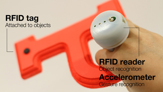 OnObject is a small device user wears on hand to program physical objects to respond to gestural triggers. Attach an RFID tag to any objects, grab them by the tag, and program their responses to your grab, release, shake, swing, and thrust gestures using built in microphone or on-screen interface.