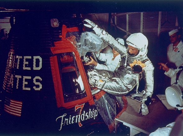 Astronaut John Glenn, Jr., enters into the spacecraft Friendship 7 to begin the first American manned Earth orbital mission. (via)