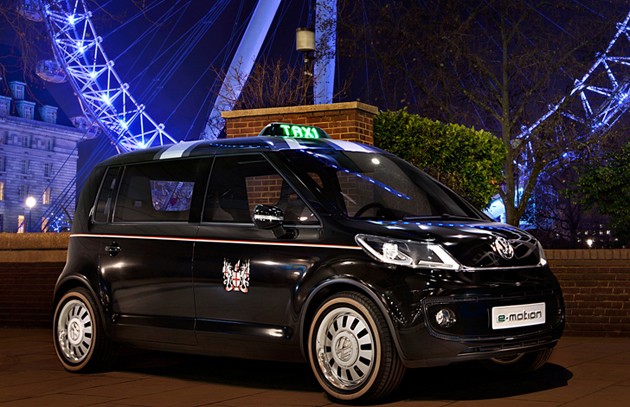 Volkswagen is putting it’s own unique spin on a London icon. The VW London Taxi Concept, which is built upon the Up! city car platform, is an electric cab with an estimated range of 186 miles. Though the overall length of 3,730 millimeters means the Taxi concept is shorter than a VW Fox, its minimal front and rear overhang allow for plenty of room to accommodate the driver and two full-size adult passengers plus luggage. Inside, the Volkswagen London Taxi Concept features touchscreen displays that provide information on the surrounding area and the route being traveled. (via Volkswagen crafts a London Black Taxi for the future — Autoblog)