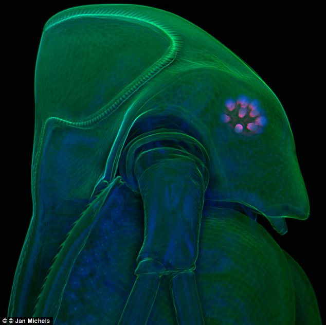 The image reveals not only the exoskeleton, but also interior detail down to the nuclei within its cells, seen as tiny, glowing blue dots. (via Under the microscope: Glowing alien-like flea takes top photography prize | Mail Online)