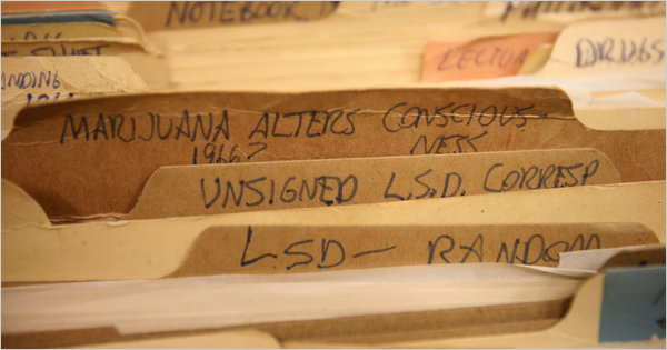 The meeting between Ginsberg and Leary marked an anchor point in the history of the 1960s drug-soaked counterculture. Leary, the credentialed purveyor of hallucinatory drugs, was suddenly invited into the center of the artistic, social and sexual avant-garde. It was Ginsberg who helped convince Leary that he should bring the psychedelic revolution to the masses, rather than keep it among an elite group. Filling out one of Leary’s research questionnaires in May 1962 the poet Charles Olson wrote that psilocybin “creates the love feast,” and “should be available to anyone.” Thomas Lannon, the library’s assistant curator for manuscripts and archives, explained that at the time these substances were not regulated by the government, and that Leary and his group did not consider them drugs but aids to reaching self-awareness. (via New York Public Library Buys Timothy Leary’s Papers – NYTimes.com)