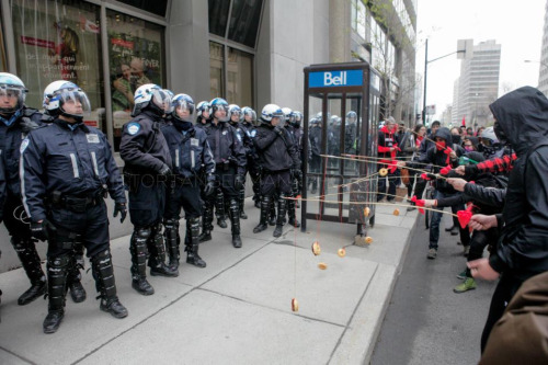 Montreal student protesters baiting riot police with donuts.