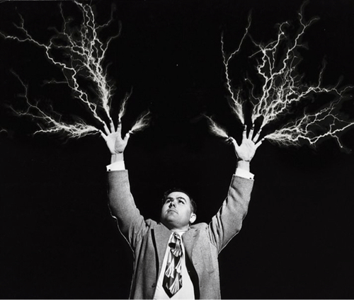 “Electricity flashes from the thimble-topped fingers of traveling “preacher-scientist” George Speake. From the 1940s into the ’60s, he was one in a series of men affiliated with Chicago’s Moody Bible Institute who demonstrated religious faith by demonstrating scientific principles. To create the lightning effect, Speake would stand atop an electric transformer coil. The room would darken. Then, at his command, a brief high-frequency current would travel over his skin, up from his feet and out of his fingertips. According to notes accompanying the image, Speake suffered no injury because “the high-frequency juice…is too fast to be felt.” Another reason he stayed safe was his extreme care in setting up the trick: The photo’s notes also warn that the practice was “for spectacle purposes only.””
