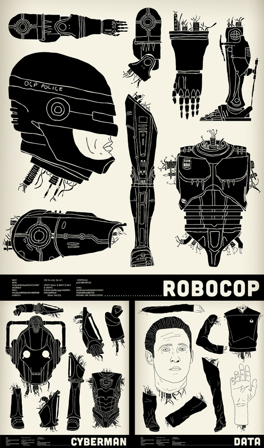 From the cat that brought us the Skeletal Spaceship Series , comes a new sweet series of prints for the nerd inside of each of us geeks. These busted n broken bots are available as prints, tees, etc…you know the drill. I suspect we’ll see more of these decommissioned prints as time passes…after all I can think of at least 3 he hasn’t chopped…can you?