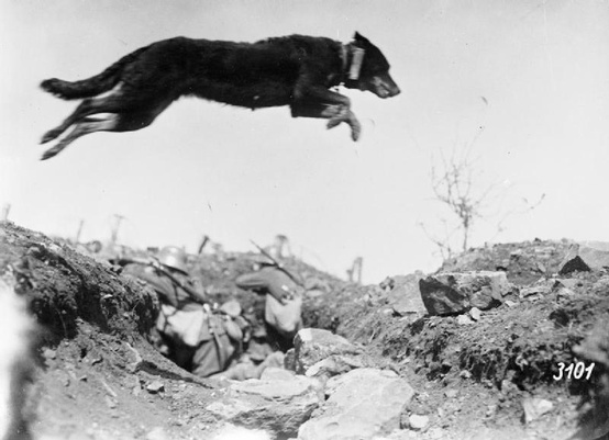 A German messenger dog leaps a trench, possibly near Sedan on the Western Front, May 1917. Two soldiers are just visible in the trench behind and beneath the dog. German First World War Official Exchange Collection, IWM.