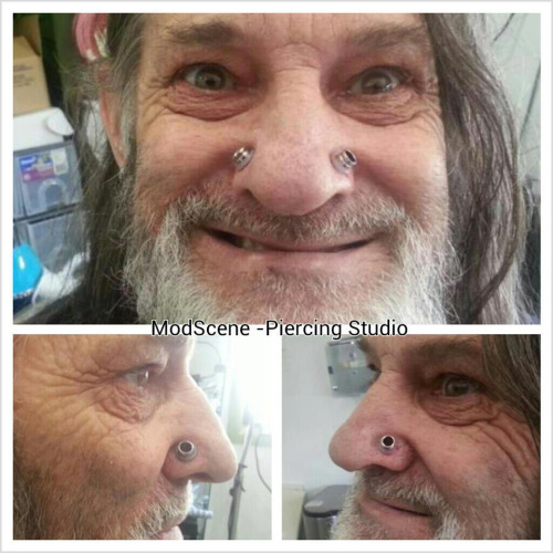 After consulting many doctors and being told that there was simply “nothing [they] could do”, he came to us with the idea of bypassing the collapsed passage by creating a hole either side of his nose which would be large enough for him to breathe through. While large-gauge nostril piercings are nothing new to body modification enthusiasts, the idea that this piercing could be functional and so practical in this particular case was a very interesting prospect.This is so cool!