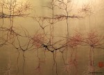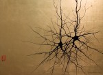 What he saw under the microscope reminded him of the uncluttered elegance of bamboo scroll paintings and other forms of Asian art, and he began to paint neurons in a similar style. He supplements traditional brush painting with methods he’s developed on his own, such as blowing a drop of ink across a surface. The ink spreads much as a neuron grows, Dunn says, propelled by a natural force, but forming random branches as it finds its way around microscopic obstacles. “I like the concept of drawing on similar forces to produce the art,” he said.