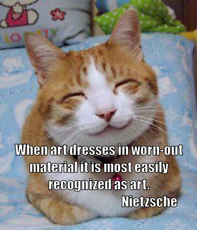 Posted on March 11, 2013September 6, 2015 by m1k3y nietzschecats: When art dresses in worn-out material it is most easily recognized as art. Share this: Click to share on X (Opens in new window) X Click to share on Bluesky (Opens in new window) Bluesky Click to share on Tumblr (Opens in new window) Tumblr Click to share on Facebook (Opens in new window) Facebook Click to share on Reddit (Opens in new window) Reddit Click to email a link to a friend (Opens in new window) Email Like Loading... Related