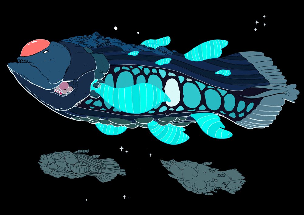 The World fish drift through space absorbing the light from neighbouring stars. The solar energy stored in their bodies powers the homes of the peaceloving creatures who live in the pyramids and domes carved into the rocks upon their backs, as well as the undulating, bioluminescent scales and fins of the great fish. However, it’s said that the crystals on their foreheads are capable of firing a wave of psychic energy capable of destroying an entire planet.