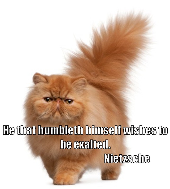 Posted on March 26, 2013September 6, 2015 by m1k3y nietzschecats: He that humbleth himself wishes to be exalted. Share this: Share on X (Opens in new window) X Share on Bluesky (Opens in new window) Bluesky Share on Tumblr (Opens in new window) Tumblr Share on Facebook (Opens in new window) Facebook Share on Reddit (Opens in new window) Reddit Email a link to a friend (Opens in new window) Email Like Loading... Related