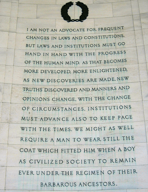 “I am not an advocate for frequent changes in laws and Constitutions. But laws and institutions must go hand in hand with the progress of the human mind. As that becomes more developed, more enlightened, as new discoveries are made, new truths discovered and manners and opinions change, with the change of circumstances, institutions must advance also to keep pace with the times. We might as well require a man to wear still the coat which fitted him when a boy as civilized society to remain ever under the regimen of their barbarous ancestors. “