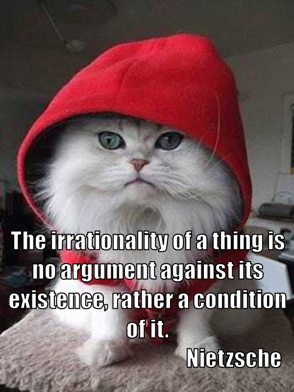 Posted on April 6, 2013September 6, 2015 by m1k3y nietzschecats: The irrationality of a thing is no argument against its existence, rather a condition of it. Share this: Share on X (Opens in new window) X Share on Bluesky (Opens in new window) Bluesky Share on Tumblr (Opens in new window) Tumblr Share on Facebook (Opens in new window) Facebook Share on Reddit (Opens in new window) Reddit Email a link to a friend (Opens in new window) Email Like Loading... Related