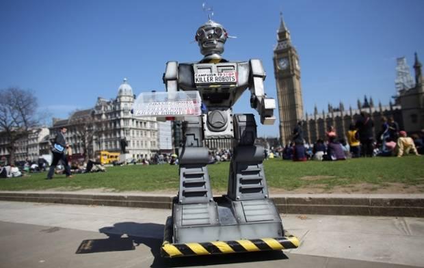 A robot distributes promotional literature calling for a ban on fully autonomous weapons in Parliament Square in London. The ‘Campaign to Stop Killer Robots’ is calling for a pre-emptive ban on lethal robot weapons that could attack targets without any human intervention