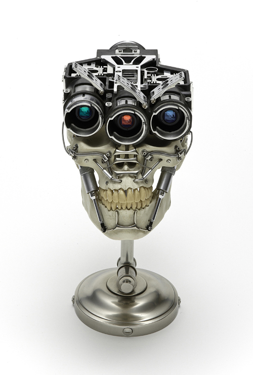Custom fabricated and found object construction featuring an embedded Ipod which projects subtle video (or visions) onto the lenses of each of the three eyes. The full color source video is mechanically broken down into the three additive primary colors (RGB). View similar works