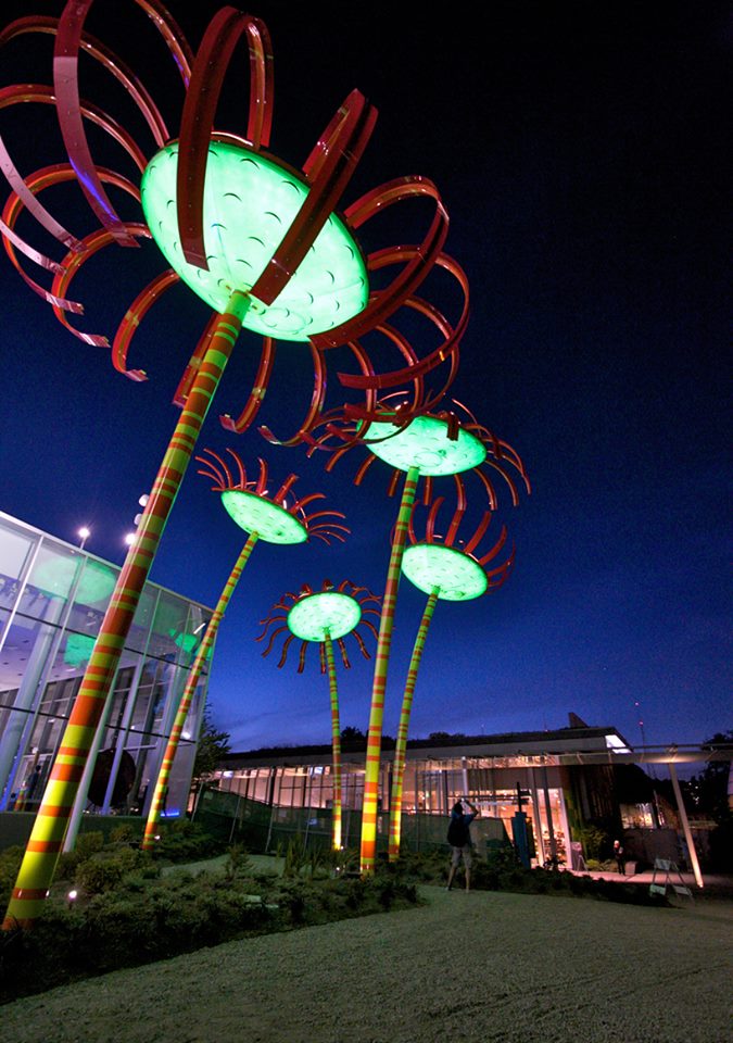 “Sonic Bloom,” a solar-powered art installation by artist Dan Corson stands in the Seattle Center’s festival grounds. The five solar flowers collect sunlight to power motion-sensor speakers, which play a chorus of interactive melodies when people walk by. The singing flowers also feature sun-powered LED lights that change colors and illuminate the sculptures at night.