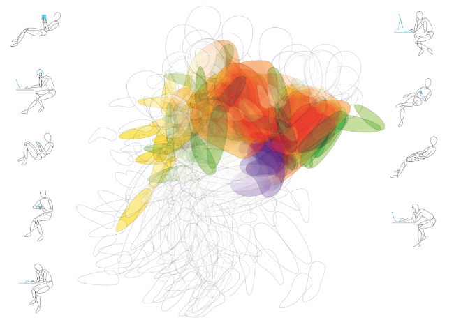 The âahaâ moment in Steelcaseâs investigation of workplace postures came when the researchers included smart devices and laptops in the study. The nine postures (left) and key movement zones (far left) they identified influenced the design of the Gesture chair, launched earlier this year. (via Ergonomics in the Digital Age)