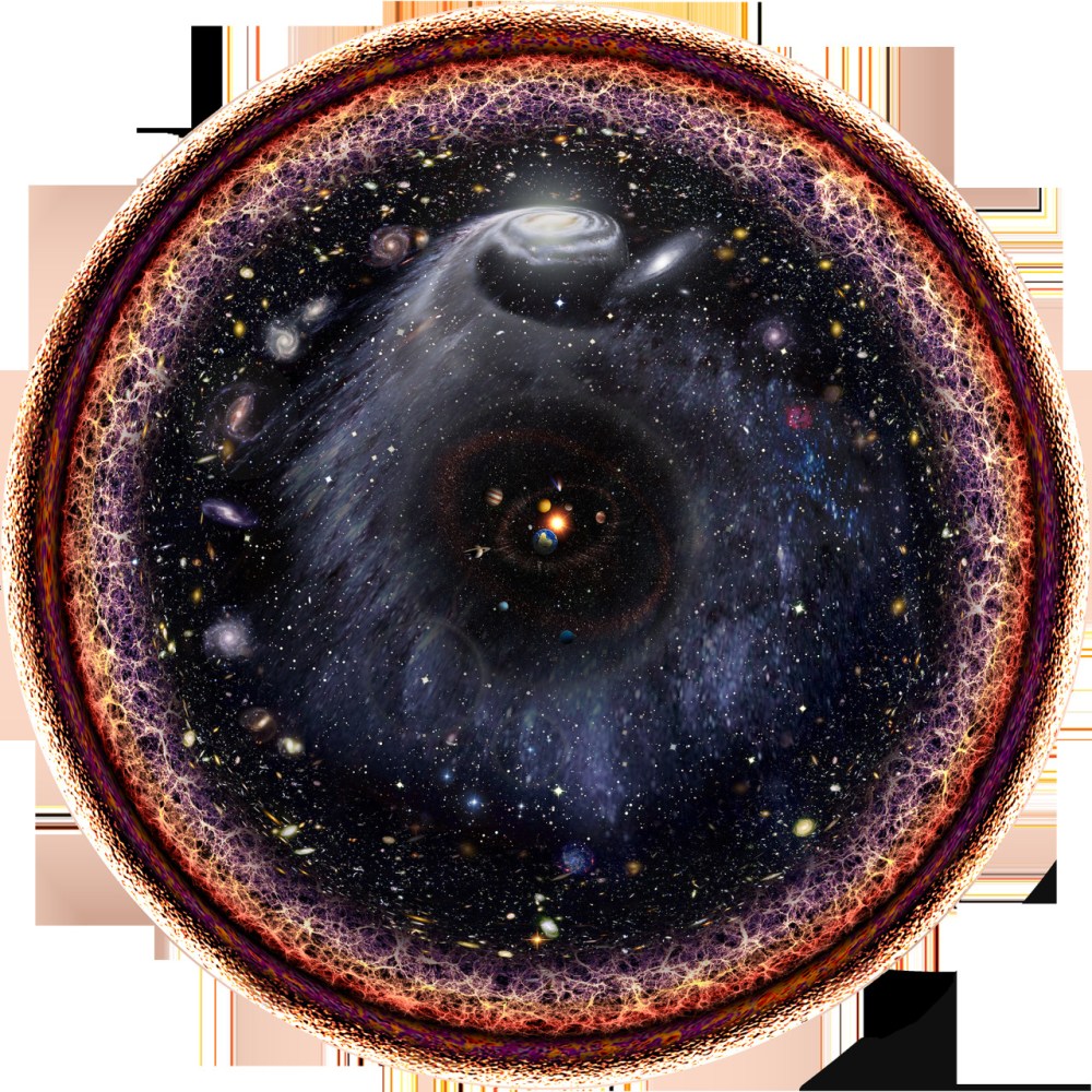 Artist’s logarithmic scale conception of the observable universe with the Solar System at the center, inner and outer planets, Kuiper belt, Oort cloud, Alpha Centauri, Perseus Arm, Milky Way galaxy, Andromeda galaxy, nearby galaxies, Cosmic Web, Cosmic microwave radiation and Big Bang’s invisible plasma on the edge. [Huge Version]