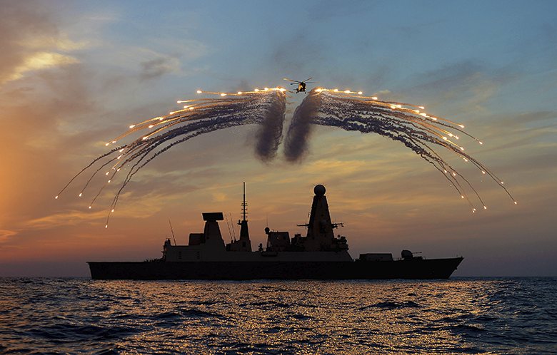 A Royal Navy Lynx helicopter from the destroyer HMS Dragon fires infrared missile defence flares above the ship during an exercise in the eastern MediterraneanPhotograph: Dave Jenkins/MoD/PA