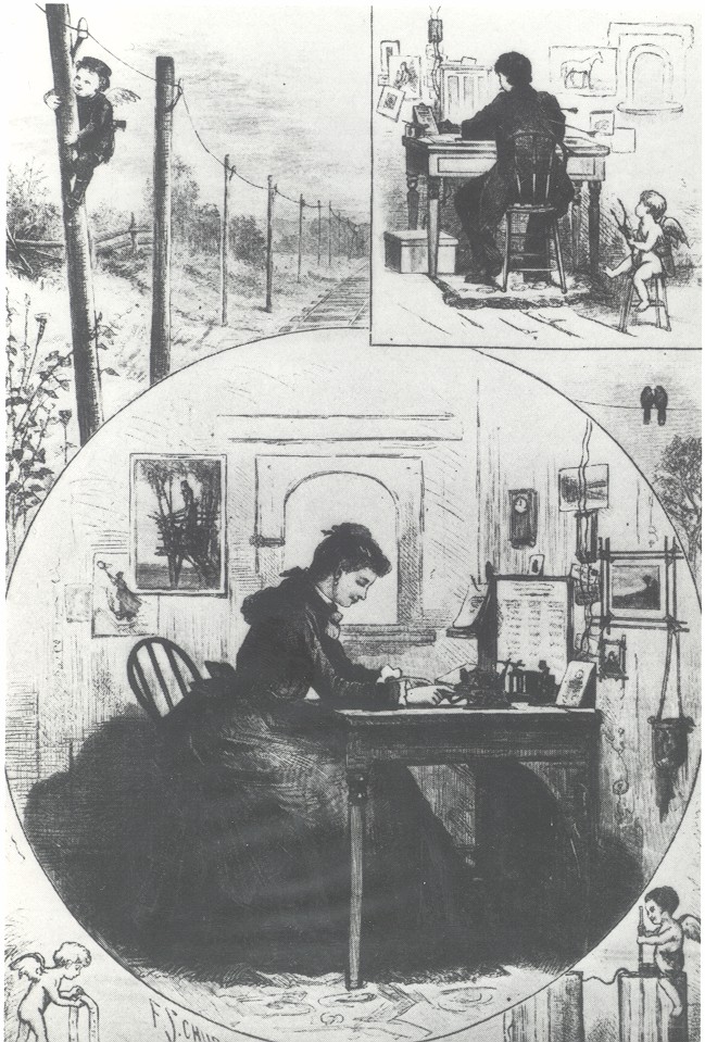 *Oh come on, that couple are not merely “using” the telegraph, they’re carrying out a telegraphic romance complete with electric cupids