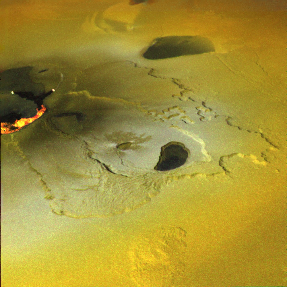 An active volcanic eruption on Jupiter’s moon Io was captured in this image taken by NASA’s Galileo spacecraft. Tvashtar Catena, a chain of giant volcanic calderas centered at 60 degrees north, 120 degrees west, was the location of an energetic eruption caught in action in November 1999. A dark, “L”-shaped lava flow to the left of the center in this more recent image marks the location of the November eruption. White and orange areas on the left side of the picture show newly erupted hot lava, seen in this false color image because of infrared emission. The two small bright spots are sites where molten rock is exposed to the surface at the toes of lava flows. The larger orange and yellow ribbon is a cooling lava flow that is more than more than 60 kilometers (37 miles) long. Dark, diffuse deposits surrounding the active lava flows were not there during the November 1999 flyby of Io.This color mosaic was created by combining images taken in the near-infrared, clear, and violet filters from Galileo’s camera. The range of wavelengths is slightly more than that of the human eye. The mosaic has been processed to enhance subtle color variations. The bright orange, yellow, and white areas at the left of the mosaic use images in two more infrared filters to show temperature variations, orange being the coolest and white the hottest material. This picture is about 250 kilometers (about 155 miles) across. North is toward the top and illumination from the Sun is from the west (left).