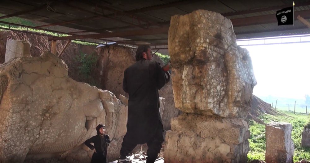 It does something to our sense of ourselves, and of humanity, when we see pictures of men, willfully and with impunity, destroying some of the world’s oldest and rarest archeological treasures. A couple of weeks ago, it was video clips of the Islamic State in Iraq and al-Sham’s extremists wielding sledgehammers and drills, methodically destroying an exquisitely carved stone lamassu, or winged man-bull, at the Assyrian complex of Nimrud, which was created by artists nearly three thousand years ago. A few days later, it was the ancient temple complex of Hatra, in northern Iraq, which was built by the Seleucid Empire around two or three centuries before Christ. Hatra had been the site of a series of glorious colonnaded buildings and statues; it is reported that beginning on March 7th, ISIS destroyed what was left of them. On Monday, there were new images on social media showing ISIS extremists attacking the grounds of St. George’s, a centuries-old Chaldean Catholic monastery outside of Mosul. In this world of all-seeing, all-hearing killer drones, these acts somehow continue.