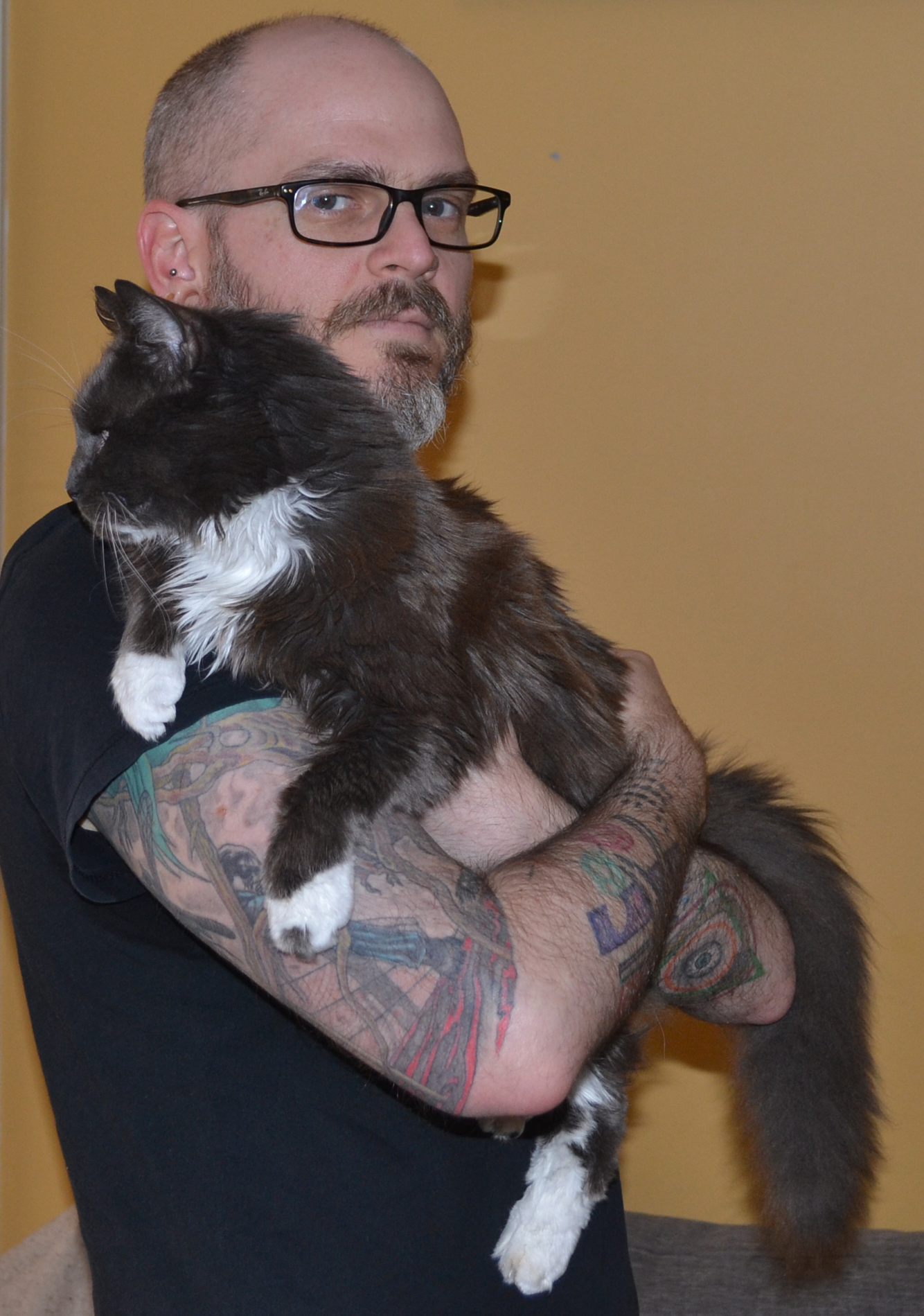 The interview began with a quick photoshoot. Corey’s workspace; a standing desk, though he does just as much work spread out on the couch. His shelves; filled with literature, science fiction, graphic novels and reference books. But the key moment to capture is Corey cradling his cat, Ella. Ella appears in Killing Gravity as the genetically engineered space witch familiar, Seven.