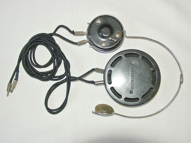 This hearing aid consists of a round carbon microphone (with no volume control), and an earphone with a detachable metal headband and an on-off switch on the back. The model shown at the right is signed General Acoustic Co. and was made sometime after 1906. (via Acousticon Model “A” Carbon Hearing Aid)