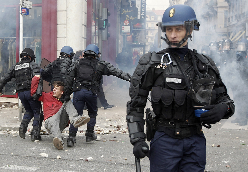 Via Bruce Sterling, who said “Particularly elegant French riot gear this season.”