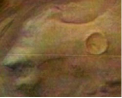 The irregular rims of these craters reveal that they are not the result of impacts by objects from space but rather have resulted from the act of creating the faces themselves. These art objects, which Basiago has named orb craters, are numerous in the ESA image. “Paranormal researchers will recognize in these works of art the faces found inside of orbs in the orbs phenomenon on Earth. Faces like these are sometimes found staring silently out from the orbs that are captured by digital cameras. The ubiquitous nature of these land forms in the vicinity of Ruell Vallis indicates how… the surface of Mars has been terra-formed into works of art that show a child-like simplicity and spontaneity.” One of these orb craters can be seen on the neck of a large terra-form featuring a barking dog lunging toward the channel of the Ruell Vallis. (via EXOPOLITICS: Politics, Government, and Law in the Universe: A “New Cydonia” of ancient extraterrestrial monuments found on Mars)