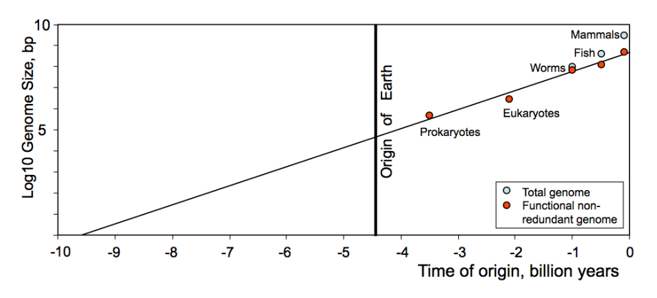 Sharov and Gordon say that the evidence by this measure is clear. “Linear regression of genetic complexity (on a log scale) extrapolated back to just one base pair suggests the time of the origin of life = 9.7 ± 2.5 billion years ago,” they say.